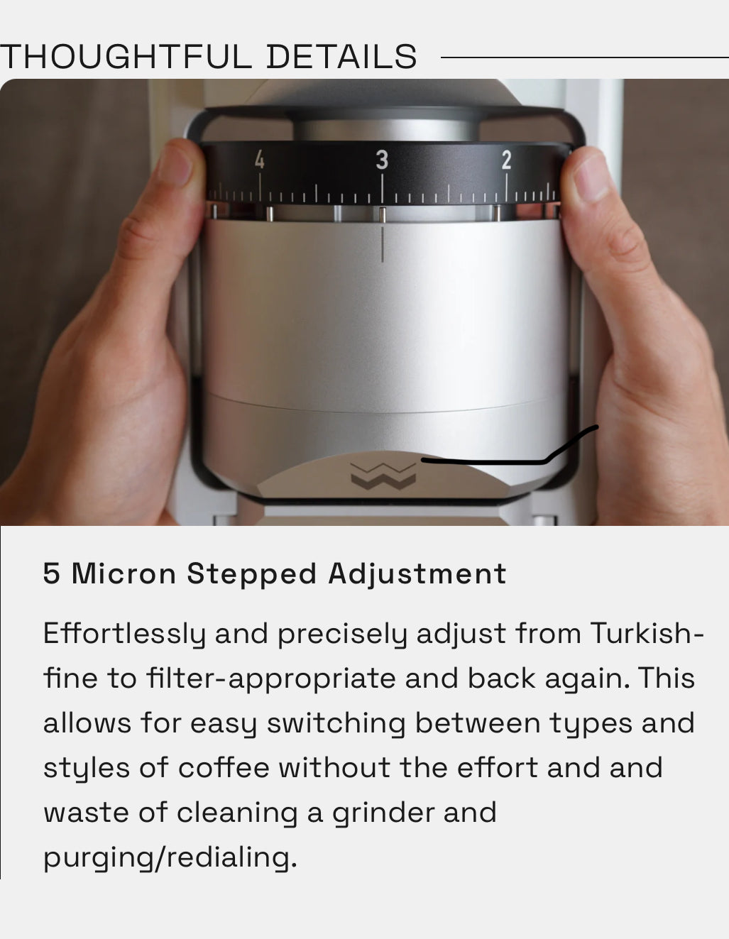 Einfach zwischen Filter und Espresso Mahlgraden zu wechseln. Dies ermöglicht einen einfachen Wechsel zwischen Kaffeesorten und Brühmethoden, ohne den Aufwand und die Verschwendung, eine Mühle zu reinigen und zu spülen/ Mahlhrad Wiedereinstellung.