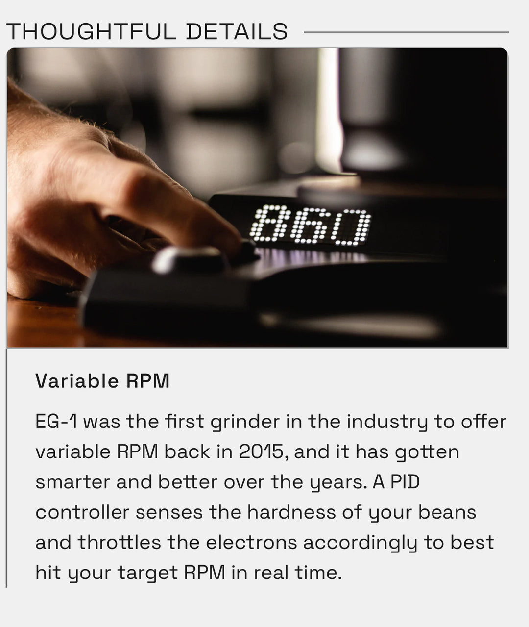 EG-1 war die erste Kaffeemühle in der Branche, die 2015 variable Drehzahlen anbot, und sie ist im Laufe der Jahre intelligenter und besser geworden. Ein PID-Controller erkennt die Härte deiner Bohnen und drosselt die Elektronen entsprechend, um Ihre Zieldrehzahl in Echtzeit am besten zu erreichen.